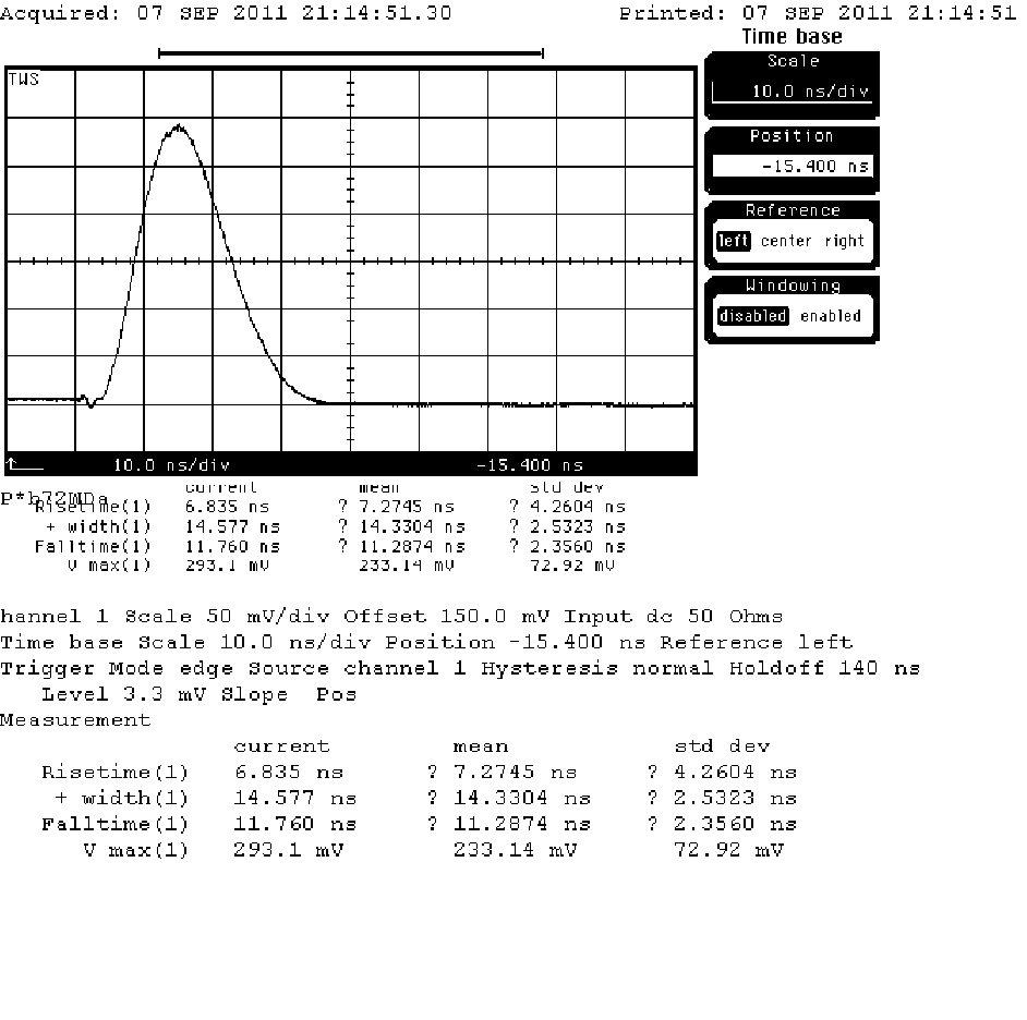 In the archives I also found some of the earlier measurements (note the datecode: September 2011), using a 54720a scope with a 54721a plug-in (4 GSa/s with 1.1 GHz bandwidth). Some pulses are barely 25 ns wide when measures correctly, which is less than 10 meters of light. I.e., the light pulse is so short that it is just about 10 meters “long”. The light source was a HL6323MG laser diode, a 639nm, 30mW AlGaInP laser diode of Ushio corporation.