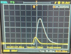 With the high breakdown voltage, it seems the light output is not much larger compared to the pulses generated by a 2N2369A at ~90 Volts, and there is considerably more ripple and noise at high breakdown voltages (white trance below is the BC546B circuit compared with the 2N2369A – yellow trace). Definitely, the classic 2N2369A (I have a stock of “JANTX” mil-spec tested devices and don’t recommend to use some copies or fake 2N2369 but rather metal TO-18 case old stock to be sure about the breakdown characteristics – modern versions and copies/fake 2N2369 may work well for common uses, but could have a completely different die inside, with random breakdown voltages).