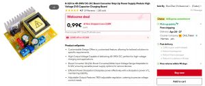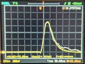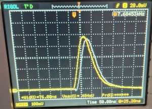 The high voltage the drive the transmitter is conveniently generated by a YH11068A DC-DC converter, available from Aliexpress for just a few dollars. Even though this module has considerable noise, it doesn’t disturb the receiver, and because of the current limiting resistor in the pulse, has also no effect on the pulse performance.
