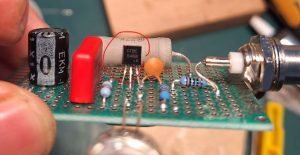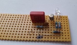 This is the board, with the BC546B soldered, it is a rather modern version of that transistor. Maybe I should have tried some older stock BC546B, BC238B and so on, but whatever you use, the breakdown voltage should not exceed 150 Volts, otherwise, you are at risk of damaging the LED. With high efficiency LEDs and 90 Volts breakdown, there is no practically relevant aging of this circuit, but at 4n7 capacity and >100 Volts, some aging will show up eventually. The lifetime of the LED will likely also depend on the pulse current, but the test circuit was build with rather low inductance traces (short wires, barely 1 cm), so the currently will be close to the highest obtainable. The LED could be soldered in with shorter leads.