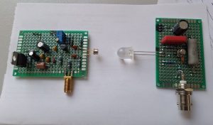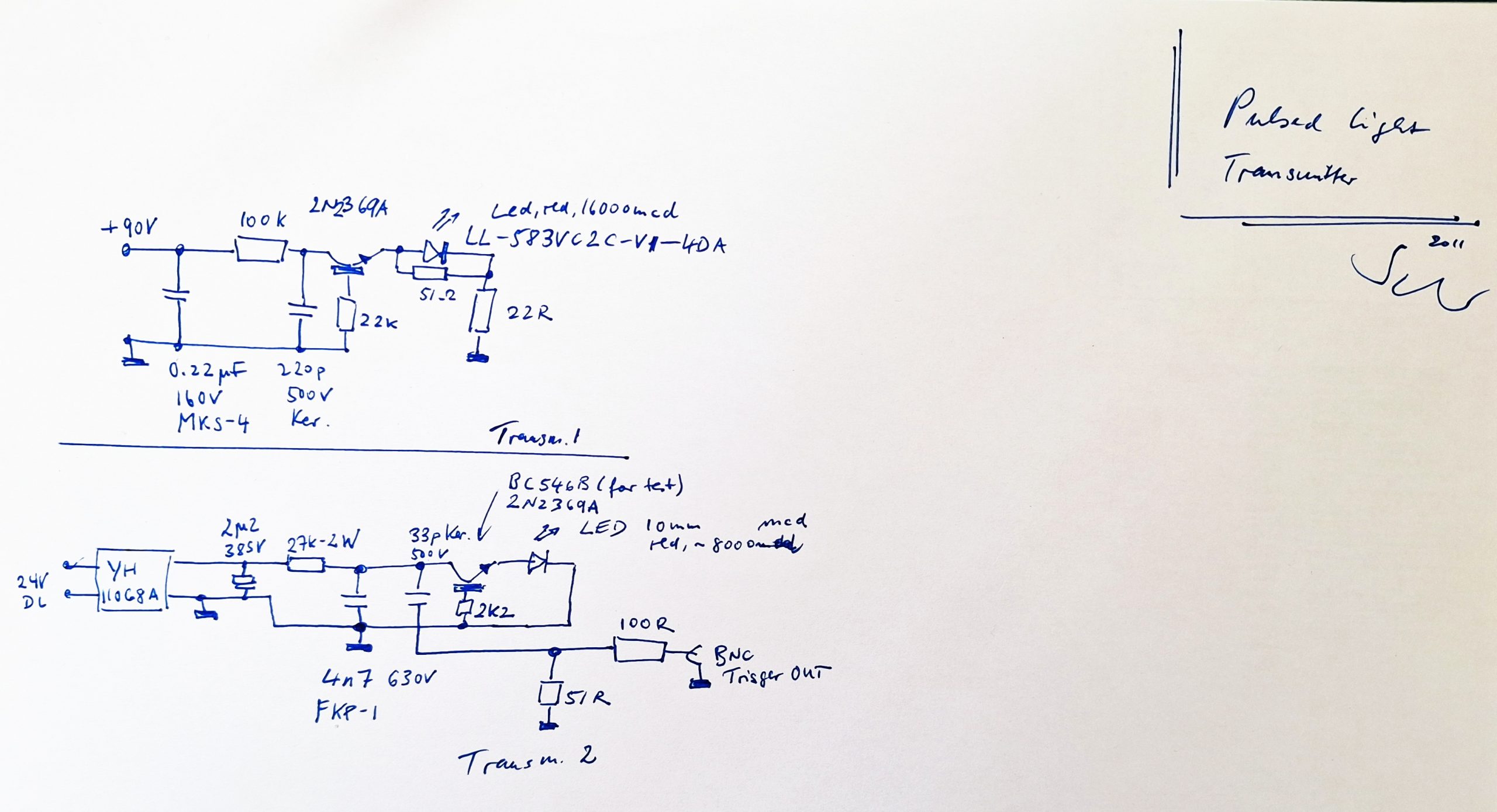 Revisiting some circuits built 15(!) years back – feels more like 10 years back, high speed light pulse transmitters and receivers. These come in handy to measure the speed of light. Nowadays, I would rather send out some train of pulses with applied digital modulation, say, a pseudorandom sequence, and then calculate the time difference digitally, from the received signal. This would surely be be very much more sensitive, but also much less instructive than receiving light pulses discretely.
