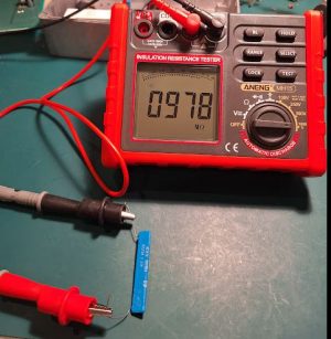 Immediately, I got some of the highest value resistors I have in stock, a Remix 1000 MOhm +-5 % resistor. This is good to 10 kV, so there is no problem or leakage when doing a 1000 V test (other resistors may be have voltage rating of 300 V or 500V).