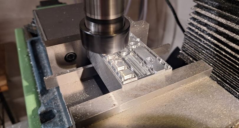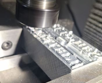 After preparing the stamp block (it will be directly heated by two 180 Watts 230 Volt heater cartridges, 10 mm diameter, 80 mm long), I set it up on my CNC mill to cut the letters. Don’t forget that all must be mirrored!