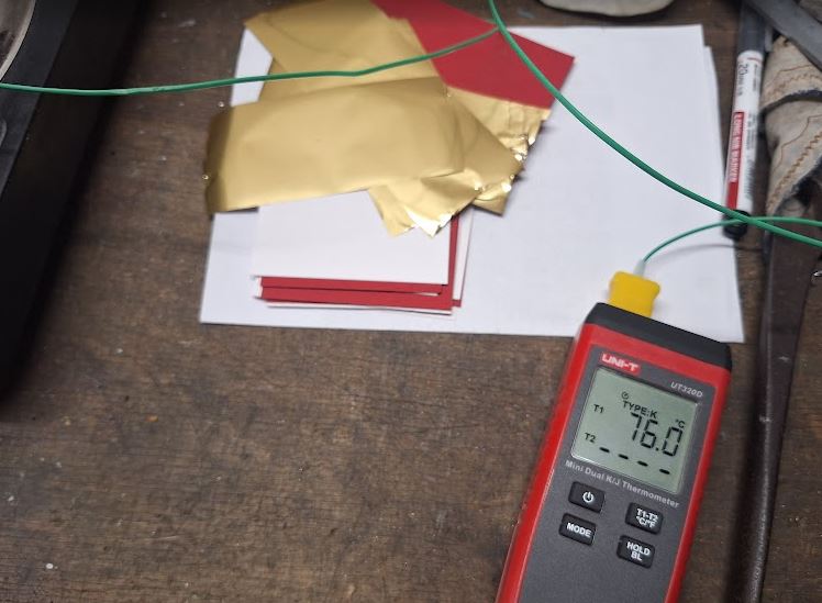The supplies prepared: some pieces of paper (always use the actual paper you want to print on), some cut strips of heat printing foil (this foil I have purchased more than 20 years back, a mid-sized coil, many meters because it is petty thin), and a thermometer to sense the temperature of the block while heating (the green wire is the thermocouple).