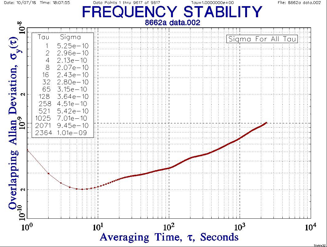 First, we try without any feedback – Allen deviation. First, the plot using the original TCXO, next, the same receiver (at the same location and setting), with the 8662A (freerunning).