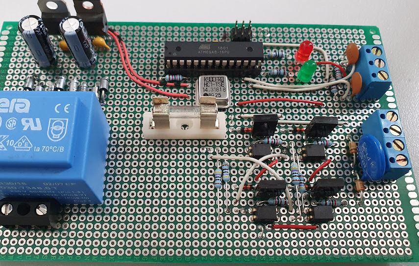 The control board is fairly simple, to test it all out, I soldered it on a piece of prototype board. Main control is by an ATMEGA8 microcontroller. This is using its own clock, from a Kyocera HC1 crystal oscillator to derive a 1 minute time interval, and and auxiliary 1 second output, for calibration purposes.